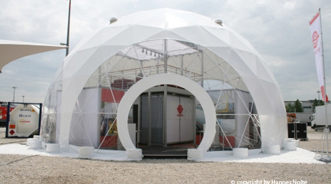 The ZENDOME aroused much interest standing on the open space of the Neue Messe in Munich. The concept used the available space for creative ideas and built a second floor into the dome, making the cupola a very special VIP area. Responsible for the open feeling of any meeting also was the new Areal-View – a large window integrated into the membrane.